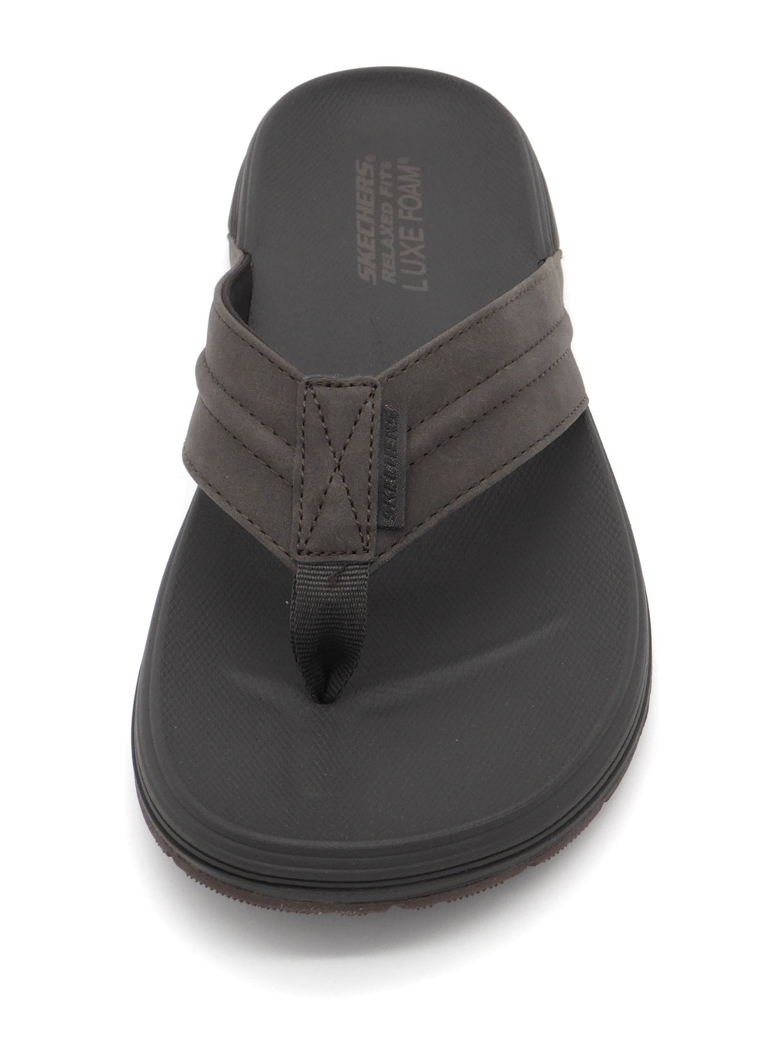 Relaxed Fit heren teenslipper Skechers Patino - Marlee heeft een bovenwerk van van glad kunstleer met stikseldetail. Het comfortabele voorgevormde Luxe Foam® voetbed geeft goede demping. Het Relaxed Fit®-ontwerp geeft een ruime, comfortabele pasvorm. Deze 3-punts teenslipper heeft een flexibele tractiebuitenzool met grip. Dit model is gemaakt van 100% veganistische materialen.
