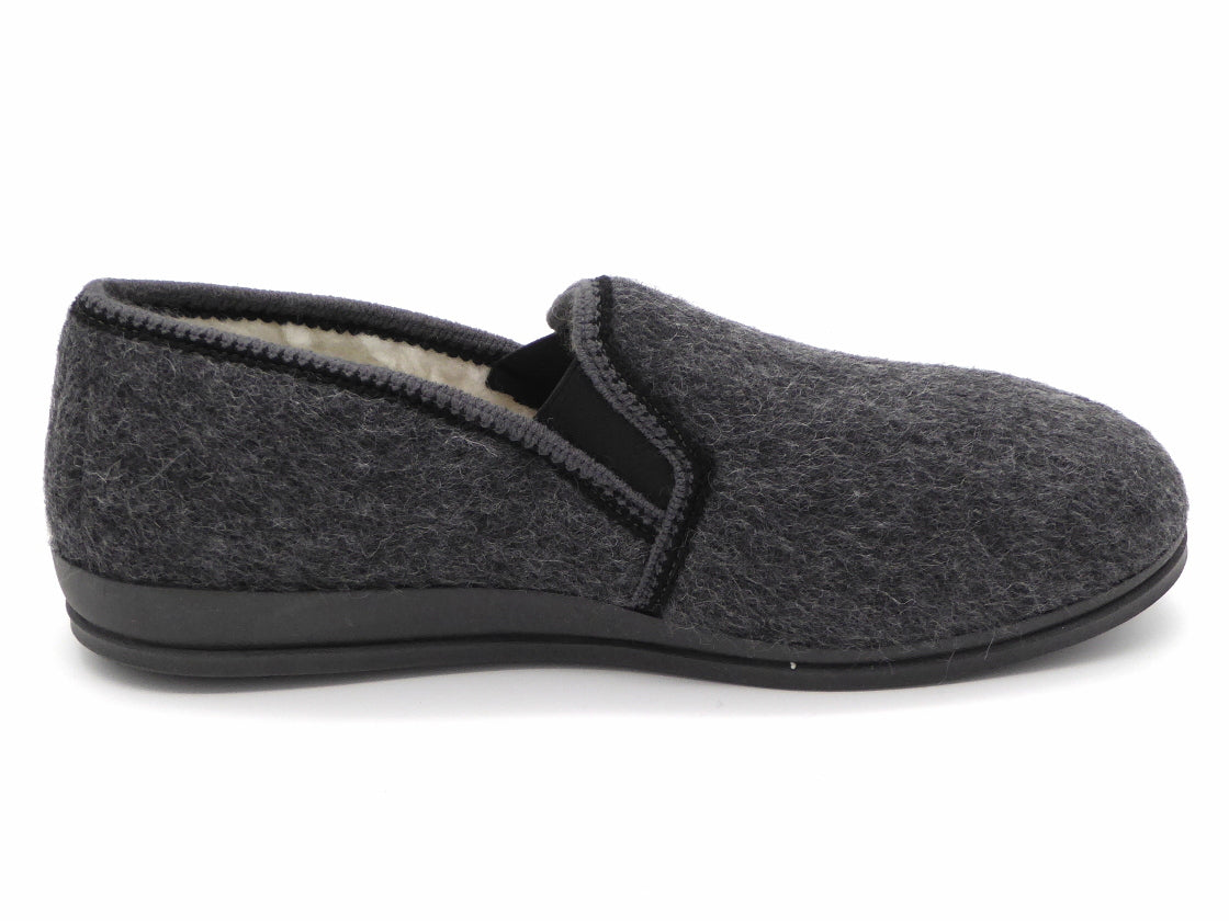 Fischer heren gesloten pantoffel model 2610 heeft een bovenwerk van wollen vilt met elastieken inzetten aan weerszijden. De voering is van heerlijk warm scheerwol die de voeten heerlijk op temperatuur houden, perfect voor de koude dagen of gewoon om thuis optimaal te ontspannen. Voorzien van een flexibele antislip PU-loopzool.