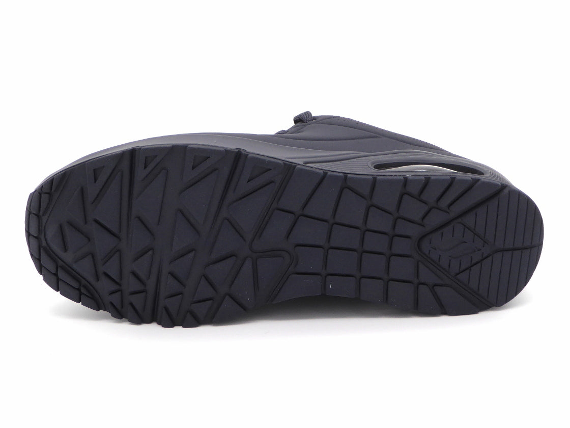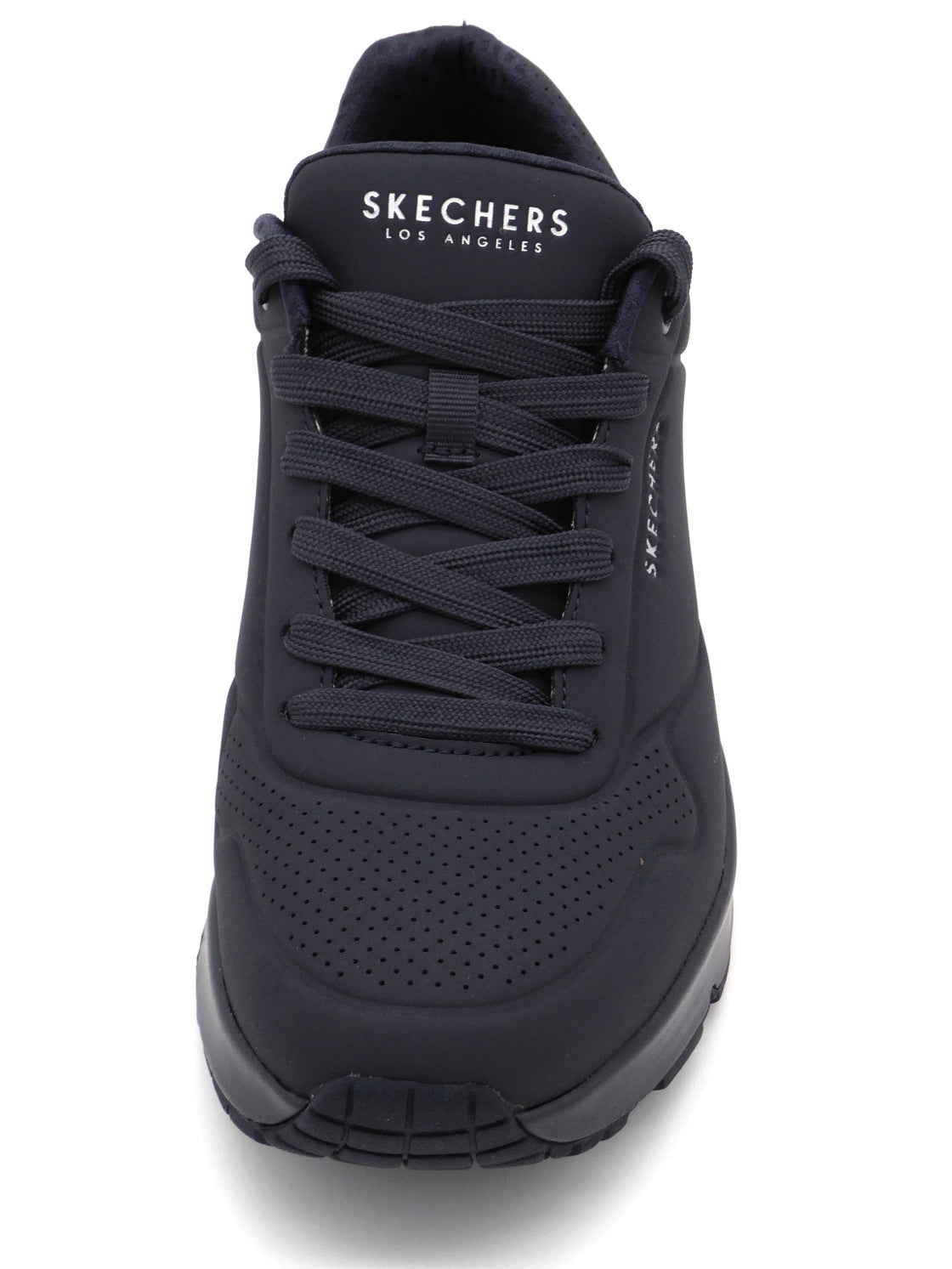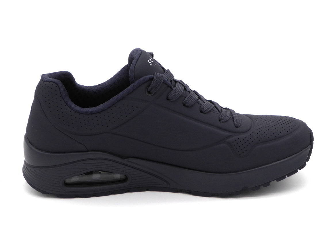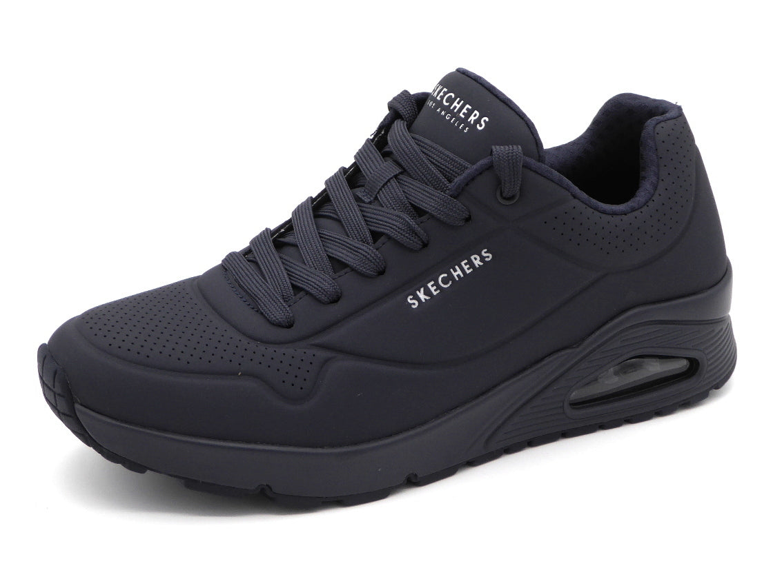 De trendy sneaker van Skechers Uno Stand On Air heeft een soepele bovenkant van geperforeerd synthetisch materiaal. De comfortabele binnenzool en de voering zijn gemaakt van textiel. De sneaker wordt gesloten door middel van een vetersluiting. Dankzij het dempende voetbed met Air-Cooled Memory Foam loopt de veterschoen extra comfortabel. Ook heeft dit voetbed een ventilerende werking. De perforaties op het bovenwerk zorgen voor een verkoelend effect. De tussenzool is voorzien van een een zichtbare Skech-Air®-airbag en biedt daardoor uitstekende ondersteuning en schokdemping bij iedere stap. De rubberen zool is flexibel en biedt veel grip. De Skechers Uno Stand On Air sneaker heeft een vast voetbed.