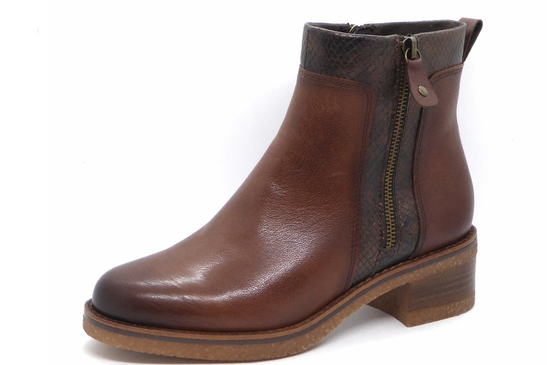 Marco Tozzi dames enkellaars, uitgevoerd in een materiaalmix van leer met een slangenprint bies (synthetisch materiaal). Deze schoen heeft een functionele ritssluiting aan de binnenzijde en een sierrits aan de buitenzijde. De voering is van textiel met een zacht 'Feel Me' foam-voetbed dat zorgt voor een fijne demping bij iedere stap. Het voetbed is niet uitneembaar. De schoen heeft een sportieve dikke zool met blokhak van 50 mm.