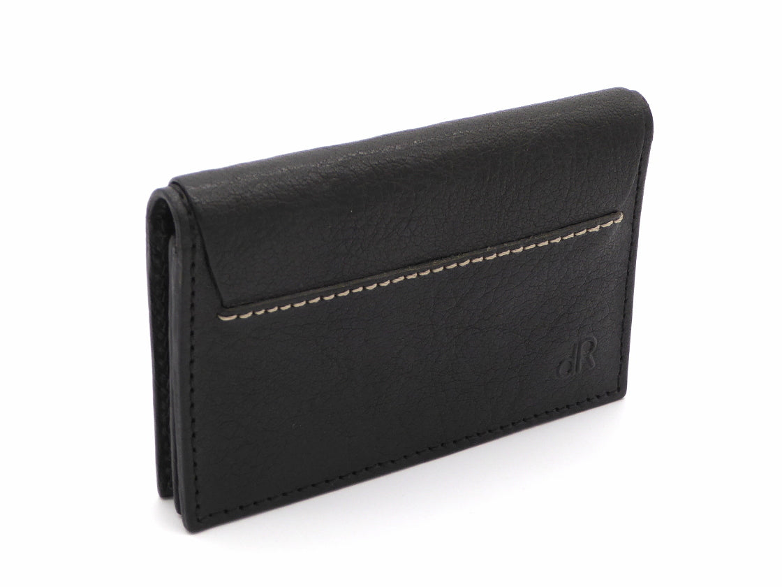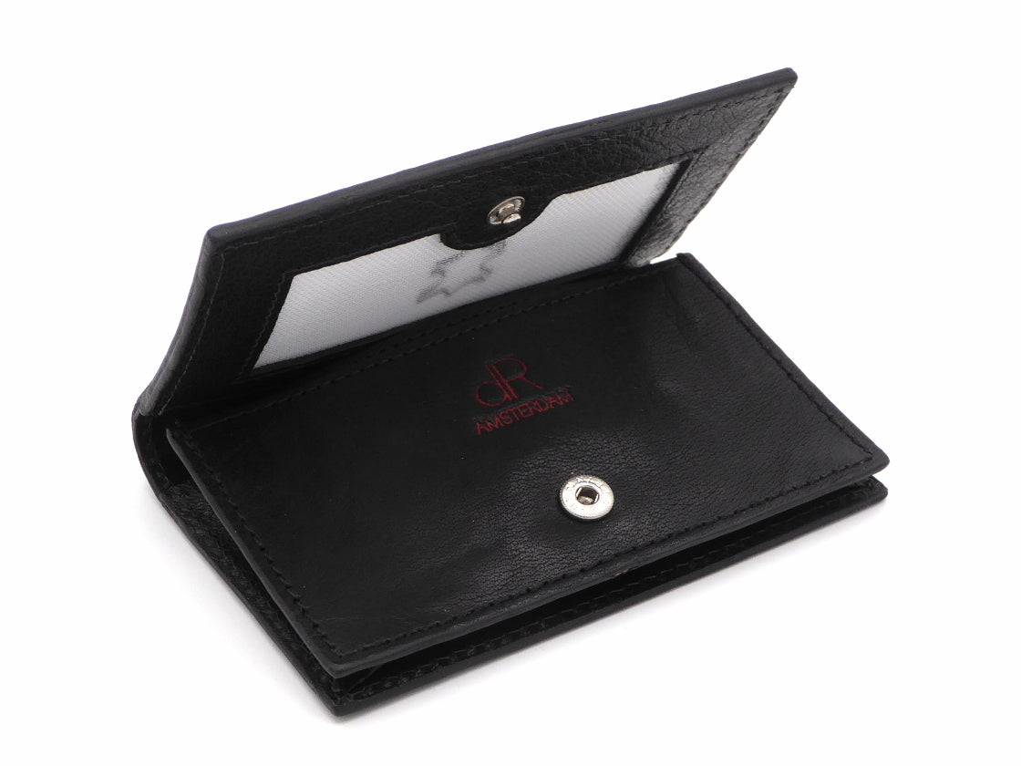 Een praktische etui voor al uw creditcards en pasjes. De etui is vervaardigd uit gewaxte rundleder en heeft een klep die naar buiten kan worden uitgevouwen. De klep is afsluitbaar met een drukknop en heeft aan de binnenzijde een steekvak waarin ongeveer twintig betaalpassen kunnen worden opgeborgen. Ook is het mogeljik hier andere benodigdheden in te plaatsen. Daarnaast is er nog een doorzichtig fotovak in de klep en een extra insteekvak aan de voorzijde.