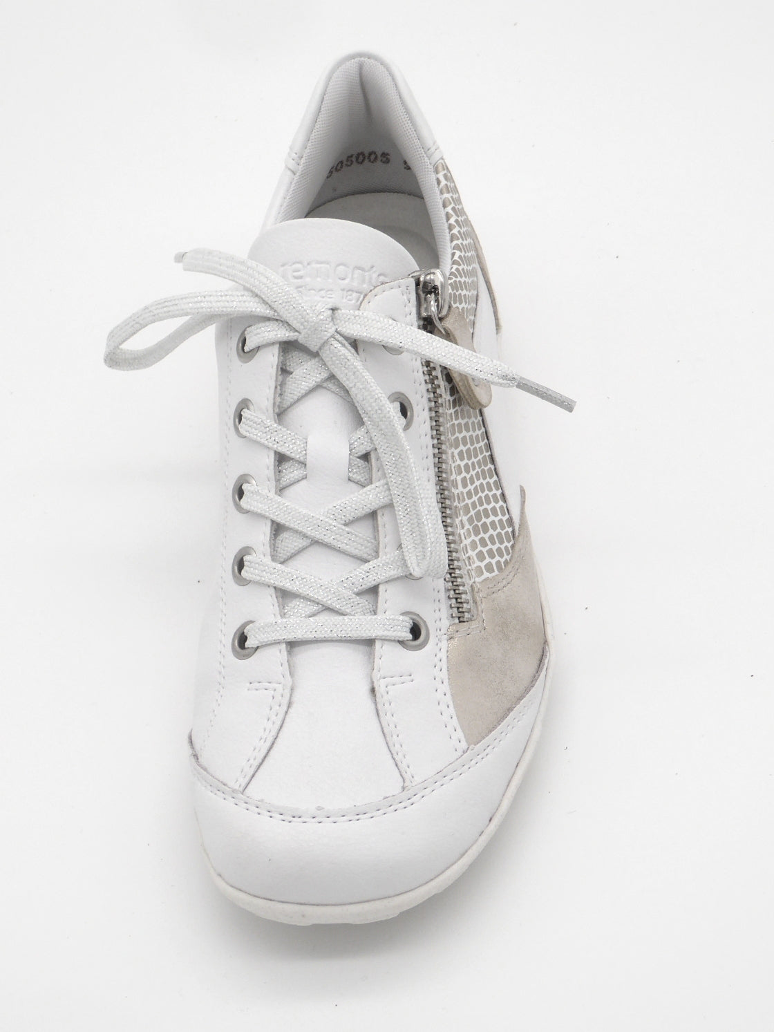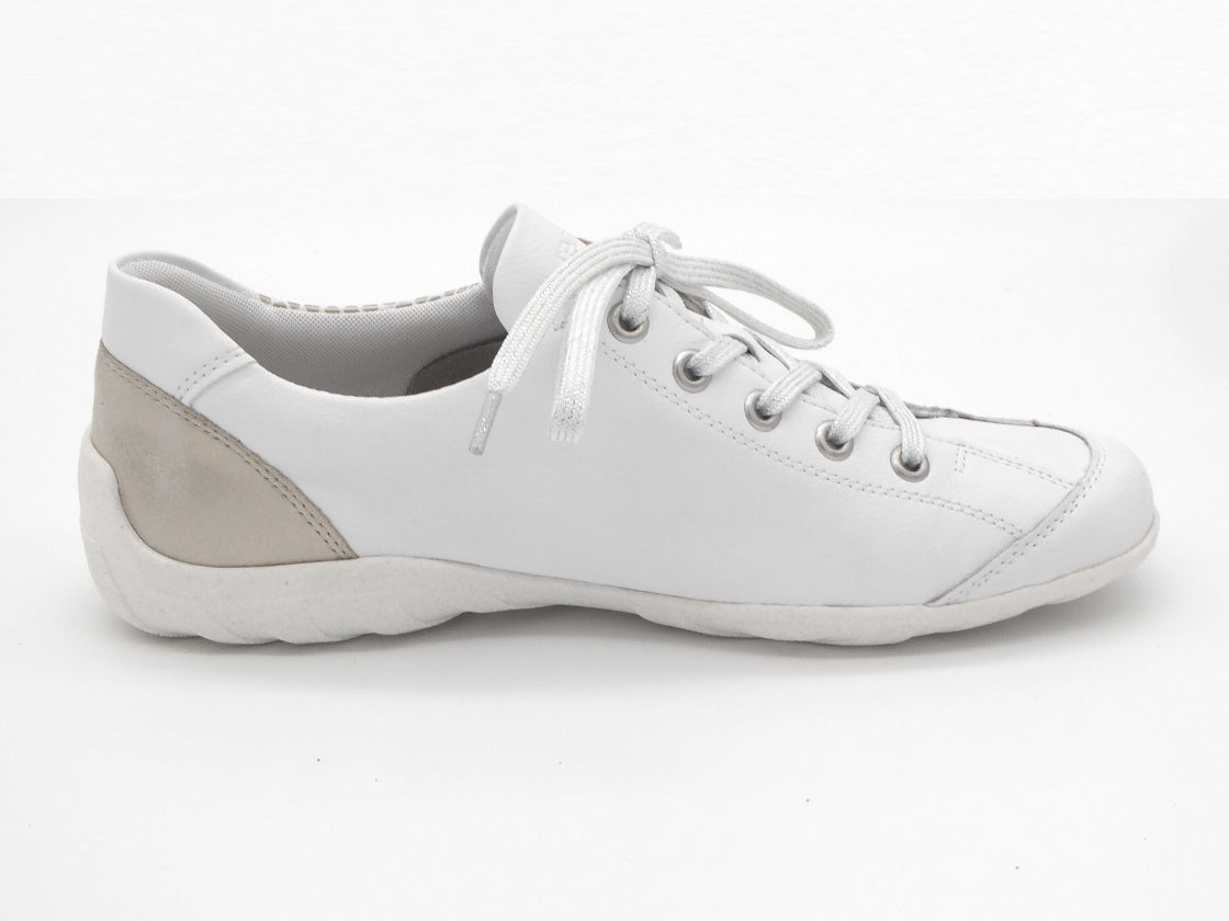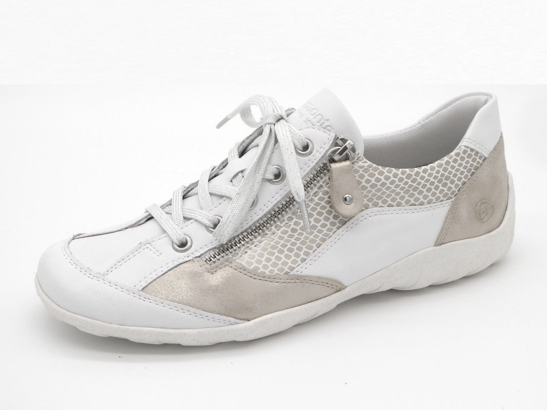 Comfortabele dames sneaker uit de Remonte Soft collectie, uitgevoerd in een combinatie van verschillende decoratieve leersoorten en imitatieleer. De sneaker heeft naast de vetersluiting ook een rits voor een gemakkelijke instap. De voering is van microvelours (textiel). Het zachte uitneembare voetbed kan, indien nodig, vervangen worden door losse inlegzolen. De sneaker heeft een gripvaste TR-zool.